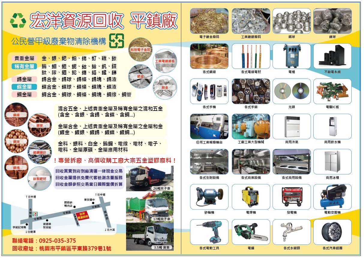 宏洋環保資源回收平鎮廠 About Us 誠信 | 效率| 永續 宏洋國際創立於2010年,深耕桃園資源回收產業,現有龍潭、大溪、平鎮等四大廠區,場地寬敞、交通便利,提供各式大型車輛清運服務。我們團隊年輕有活力,導入創新管理,制度完善,持續擴點,歡迎有志夥伴一同加入。長期配合各地工廠、學校與工程單位,清運效率高、處理量大,服務全台皆可到位。全廠磅秤皆通過經濟部檢驗合格,品質有保障。 這不是回收廠 這是資源的重生工坊 回收不是丟掉,而是交給對的人。 專注細節,成就信任 若有任何問題,歡迎與我們聯繫 姓名 電話 Line ID 諮詢內容 送出 服務項目 回收資源分類紙類、各類塑膠、各類五金金屬、3C家電、電池(瓶)、大小型機台、銅線材、電子料、其他回收等 雜物清運服務居家(透天厝)/工廠/辦公室廢棄物清除,現場估價,快速派車 大型物件處理木材、傢俱、裝潢殘料、機器、廢鐵、下腳料、保麗龍 室內外拆除工程廠房、鐵皮或住家、店面、室內裝潢拆除、清運一條龍 成功案例|看得見的改變,感受得到的專業 從場勘、分類到清運,每一步我們都按部就班、效率至上。 圖中案例為實地清除雜物前後對比,空間整潔恢復如新,客戶高度滿意。 宏洋環保,您的安心選擇。 BeforeAfter 清運處理 一站搞定 ● 建案拆除、木作料件即時清運● 工地廢料、家庭雜物一車處理● 店面設備、餐飲器具中古回收 點擊右圖以放大檢視→ 服務地區與車種 大台北全區、新竹全區、桃園市全區皆可服務龍潭區、大溪區、楊梅區、平鎮區、中壢區、八德區、桃園區、復興區、新屋區、觀音區、大園區、蘆竹區、龜山區車種3.5噸貨車、夾子車、各式吊卡、怪手和大型機具 宏洋環保資源回收平鎮廠 1. 歡迎加入宏洋環保資源回收平鎮廠line@,或是來電聯繫。2. 提供您的聯繫資訊(姓名、電話)。3. 請敘述您的需求(清運地點、物件概況、期望日程……)。4. 需清運或拆除的物件照片上傳。5. 我們將儘速與您聯繫! 營業時間:週一至週六 08:00 至 18:00 桃園市平鎮區平東路379巷1號(官路缺鴨肉對面) LINE 聯絡方式: 吳哲豪:0922380992 顏韶毅:0956659119 填寫表單